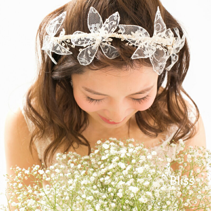フラワーレースの中央にラインストーン、フラワーレース周辺には小枝が施され、女性らしい印象で、個性的な花嫁様を演出致します。
